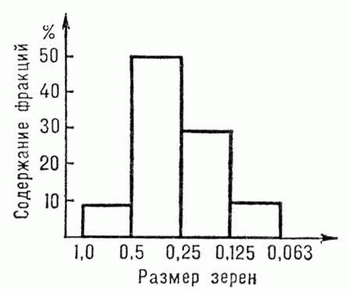 В виде Г. часто изображают гранулометрический состав горных пород. В этом случае на вертикальной оси откладывают процентное содержание полученных групп частиц т. н. фракций, а на горизонтальной оси - логарифмы их граничных размеров (рис. 2). Использование логарифмов вызвано тем, что при гранулометрическом анализе частицы подразделяются на фракции, размеры которых убывают в геометрической прогрессии. Иногда Г. строятся на произвольно выбранных равных отрезках, независимо от разности граничных размеров фракций. Тогда высоты столбиков пропорциональны содержанию размеров фракций.